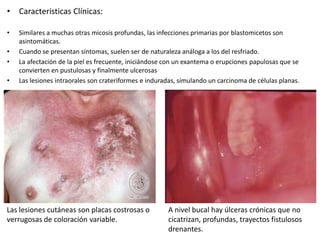 La blastomicosis es causada por el hongo dimórfico Blastomyces dermatitidis y se presenta predominantemente en América del Norte y partes de África. Los síntomas incluyen erupciones cutáneas, úlceras orales y fiebre, con lesiones que simulan cáncer de piel o de boca. El diagnóstico se realiza mediante biopsia que muestra esporas del hongo dentro de células gigantes. El tratamiento de elección es anfotericina B, excepto para infecciones pulmonares no complicadas