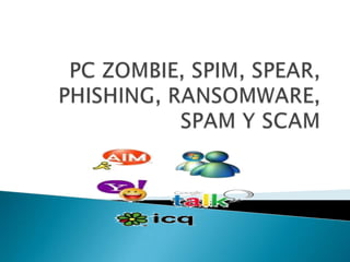 Este documento trata sobre varios temas relacionados con ciberseguridad como zombis informáticos, SPIM, phishing, ransomware y correo basura. Define cada uno de estos términos y describe brevemente sus características.