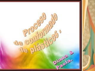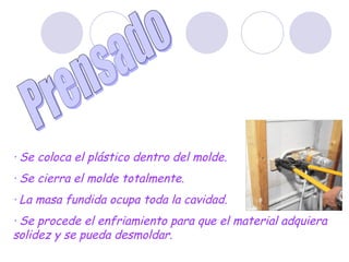 Este documento describe diferentes procesos de conformado de plásticos como prensado, extrusión, inyección, soplado y laminación por calandrado. En el proceso de prensado, el plástico se coloca en un molde que se cierra y enfría para solidificar el material. En la extrusión, el plástico fundido pasa por un tornillo que lo extruye a través de una boquilla de diseño. El proceso de inyección inyecta plástico fundido en un molde usando un pistón. El soplado usa