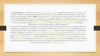 La hamburguesa es un alimento en forma de bocadillo de carne picada cocinada a la parrilla o plancha y servida en un pan partido. Se originó en el siglo XIX y creció en popularidad en el siglo XX junto con el auge de las cadenas de comida rápida como McDonald's. En la actualidad, es un alimento global encontrado en casi todas las culturas y existen varios concursos para determinar la mejor hamburguesa en diferentes ciudades.