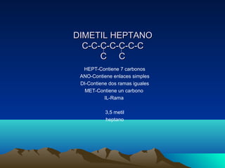 El documento presenta la estructura química y nomenclatura de varios compuestos orgánicos alifáticos. Define los términos metilo, butano, dimetil, heptano, propeno, buteno, pentino, explicando el número de átomos de carbono y los tipos de enlaces entre ellos para cada compuesto.