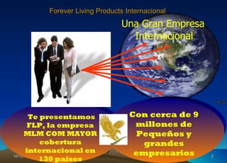 Este documento promueve una oportunidad de negocio con Forever Living Products (FLP), una compañía multinivel de productos de aloe vera presente en más de 130 países. Ofrece altos ingresos potenciales a través de comisiones por ventas propias y de su equipo, así como bonificaciones de liderazgo. Detalla los diferentes roles como asistente, supervisor y gerente que se pueden alcanzar con el tiempo y el reclutamiento de nuevos miembros. Finalmente, anima a las personas interesadas a unirse a FLP invirt