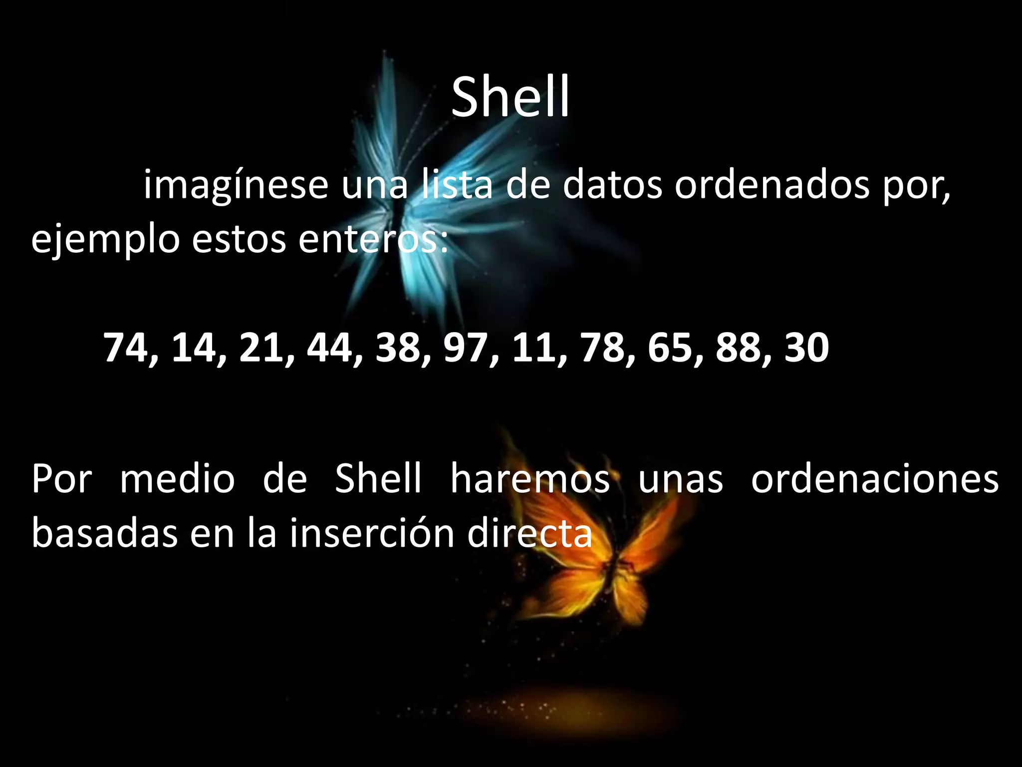 Este documento describe diferentes algoritmos de ordenación como la inserción directa, el método de la burbuja y el mergesort. Explica cómo cada algoritmo ordena una lista de números de forma incremental reubicando los elementos para colocarlos en su posición correcta.