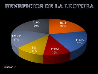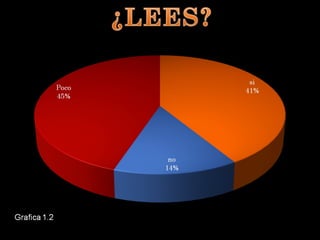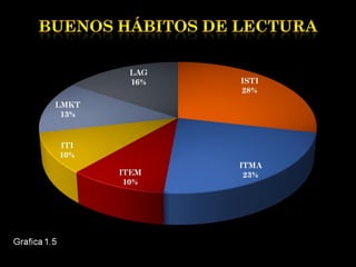 El documento describe un estudio sobre los hábitos de lectura de los estudiantes de la UPSLP. Presenta la delimitación del problema, preguntas de investigación, objetivos, hipótesis, diseño de investigación y bibliografía. El estudio analizará los hábitos de lectura de los estudiantes a través de encuestas para identificar factores como la cantidad de libros leídos y géneros preferidos, con el fin de fomentar una mejor comprensión lectora.