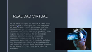 La realidad virtual es una tecnología que simula un entorno tridimensional generado por computadora, donde el usuario puede interactuar de forma inmersiva a través de dispositivos como cascos, guantes y audífonos. Desde los años 90, se han incorporado estímulos sensoriales que enriquecen la experiencia virtual, encontrando aplicaciones en educación, videojuegos, medicina y más. Además, las redes sociales facilitan la conexión y la interacción entre personas, convirtiéndose en un foco de estudio en antropología y sociología.