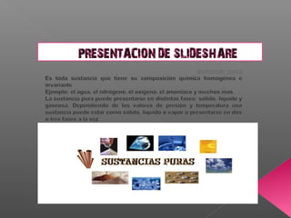 El documento describe los diferentes estados de equilibrio que puede presentar una sustancia pura, incluyendo las fases líquida, sólida y vapor. Explica que el agua puede encontrarse como líquido y vapor dentro de una olla a presión, o como hielo sólido a temperatura y presión normales. Además, introduce los conceptos de línea de saturación, punto crítico y superficie termodinámica P-v-T para representar gráficamente los estados de equilibrio de una sustancia.