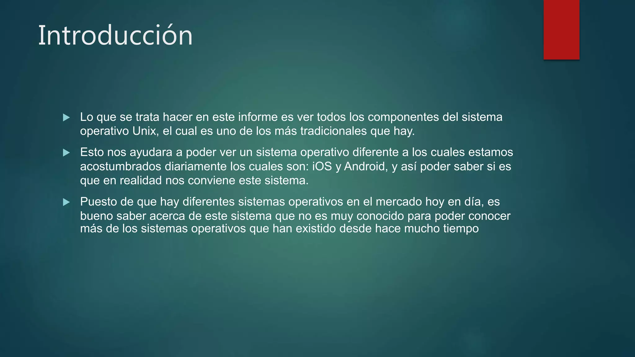 Este documento resume las características y componentes del sistema operativo Unix. Explica que Unix es un sistema operativo desarrollado en 1969 que ofrece programas pequeños para unirlos y crear acciones complejas. Provee herramientas como el shell para interpretar comandos. Sus características incluyen ser compatible, de código abierto, permitir correr programas propios y tener buena presentación. Su núcleo asigna recursos y controla procesos y dispositivos. El documento concluye resumiendo ventajas como ser gratuito, estable