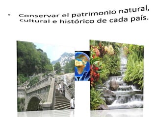 El documento presenta tres formas de conservar el medio ambiente: 1) Ahorrar energía apagando las luces cuando no se usen y aprovechando la luz natural, 2) Evitar el desperdicio de agua cerrando bien las llaves y 3) Reciclar diferentes materiales y usar cosas biodegradables para reducir la contaminación.