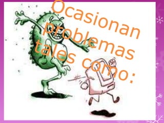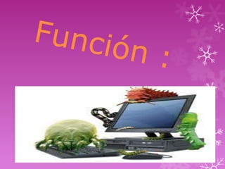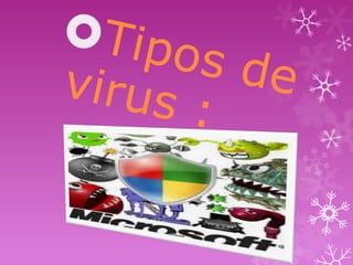 Este documento describe los virus, antivirus y sus características. Los virus son programas maliciosos que se propagan y dañan sistemas, mientras que los antivirus previenen, detectan y eliminan virus usando bases de datos y técnicas heurísticas. El documento también explica diferentes tipos de virus como troyanos, gusanos y caballos de Troya, y diferentes tipos de antivirus como antivirus en línea, de software, residentes y eliminadores.