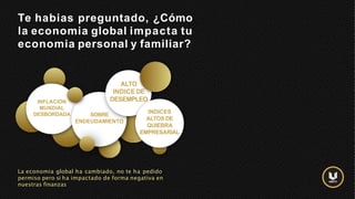 El documento analiza cómo la economía global afecta las finanzas personales y destaca la importancia de adquirir conocimiento oportuno para aprovechar oportunidades, como inversiones en criptomonedas y tecnología. Presenta a Validus, una empresa de marketing que ofrece un modelo de suscripción para acceder a información valiosa y programas de recompensas. También detalla beneficios como el interés compuesto sobre puntos de recompensa y opciones de inversión en productos y experiencias exclusivas.