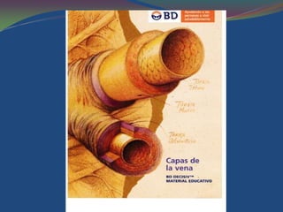 El documento describe el procedimiento para la administración de líquidos y medicamentos por vía intravenosa, incluyendo la selección de venas, el material necesario y los pasos a seguir para realizar la punción venosa de manera segura y efectiva. Se destacan las utilidades de la venopunción, las complicaciones posibles como la infiltración y la embolia gaseosa, así como la importancia de seguir normas de asepsia para evitar efectos adversos en los pacientes. La técnica debe realizarse con precaución, observando la respuesta del paciente y ajustando el flujo según las prescripciones médicas.