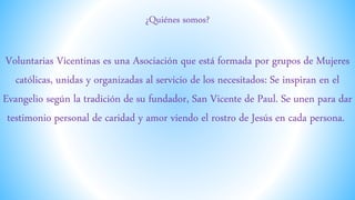 Las Voluntarias Vicentinas es una asociación de mujeres católicas en el Estado de México que se dedica a mejorar la calidad de vida de personas de escasos recursos a través de diversos programas de apoyo. Sus servicios incluyen el reparto de despensas, ropa, alimentos, y la atención a ancianos y enfermos. En total, los centros de la organización brindan 36,698 horas de servicio al año en la región.