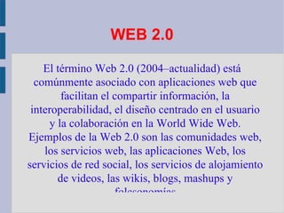 El documento describe varias herramientas y aplicaciones web 2.0 como Blogger, Edublogs, Facebook Chat, Xtimeline, Dropbox, FriendFeed, Google Docs, Live Documents, Prezi, Bloglines, Picnik, Bing, Delicious, Ning, Survs, Spaaze, Skype, Kaltura, Webs.com y Wikia, explicando brevemente sus funciones y objetivos.