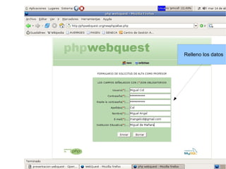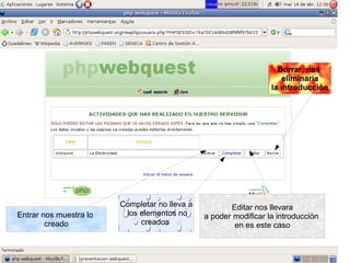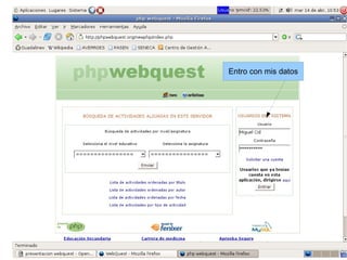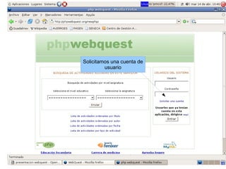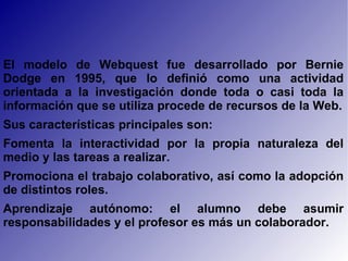Este documento describe las características principales de las Webquest, una actividad de aprendizaje desarrollada por Bernie Dodge en 1995 que utiliza recursos de Internet. Las Webquest fomentan la interactividad, el trabajo colaborativo y el aprendizaje autónomo. Siguen un modelo constructivista donde los estudiantes elaboran su propio conocimiento a través de la interacción con recursos y otros estudiantes. Las Webquest también permiten la investigación interdisciplinaria y el desarrollo del conocimiento mientras los estudiantes navegan por la web con un objetivo