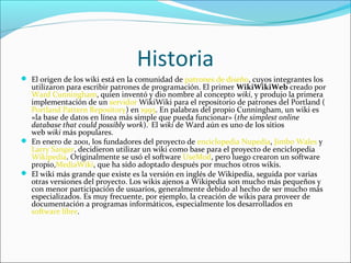 Los wikis se originaron en la comunidad de patrones de diseño en 1995 cuando Ward Cunningham creó el primer wiki para compartir patrones de programación. Wikipedia fue lanzada en 2001 utilizando software wiki para permitir la edición colaborativa de enciclopedias. Los wikis permiten que múltiples usuarios editen contenido en línea de forma rápida e inmediata a través de una interfaz simple. Si bien esto permite una gran participación, también existe el riesgo de que la información no sea fiable.