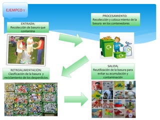 El documento presenta 5 ejemplos de sistemas que ilustran el proceso de análisis y diseño de sistemas. Cada ejemplo describe las entradas, procesamiento, retroalimentación y salidas de sistemas como la recolección de basura, producción de cerveza, fabricación de celulares, producción de muebles de madera y construcción de edificios.