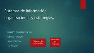 El documento habla sobre los sistemas de información gerencial y su impacto en las organizaciones. Explica que los sistemas de información pueden afectar los costos de una empresa y son un factor de producción clave. También describen cómo los sistemas de información pueden usarse para mejorar la eficiencia a lo largo de la cadena de valor de una empresa y fortalecer las relaciones con los clientes y proveedores.