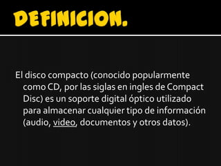 El disco compacto fue creado en 1979 por holandeses y japoneses para almacenar datos digitales. Se popularizó en la década de 1980 gracias a la promoción del director de orquesta Herbert von Karajan. Los CD permiten almacenar hasta 700 MB de información de manera duradera y son uno de los formatos más utilizados para distribuir audio, video y datos.
