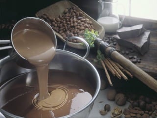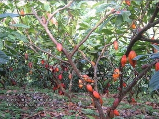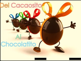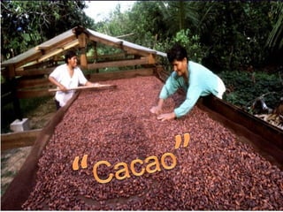 Este documento resume la historia del cacao y el chocolate. Comienza describiendo el primer contacto europeo con las semillas de cacao en 1502 y cómo Hernán Cortés fue el primer europeo en probar el cacao y su bebida. Luego describe cómo actualmente se cultiva el cacao en los trópicos y los países donde se producen los cacaos más apreciados. Finalmente resume los beneficios estimulantes y antidepresivos del chocolate debido a las sustancias que contiene como la teobromina, fenetilamina y cafeína.