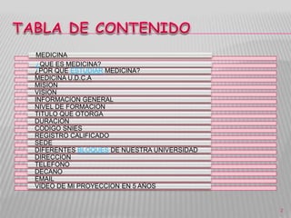 El documento detalla la misión y visión de la facultad de medicina de la Universidad de Ciencias Aplicadas y Ambientales (U.D.C.A.), resaltando su enfoque integral y ecosistémico en la formación de médicos. Se enfatiza la importancia de estudiar medicina por su impacto social y la satisfacción de ayudar a diversas comunidades. La facultad busca posicionarse como líder en la formación de médicos enfocados en atención primaria y desarrollo sostenible en cinco años.