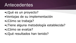 Este documento describe el aprendizaje basado en proyectos como una estrategia educativa. Explica que los estudiantes planifican, implementan y evalúan proyectos que resuelven problemas reales más allá del aula. También describe los roles del profesor y los estudiantes, así como las etapas de un proyecto que incluyen la identificación de una problemática, la definición de objetivos y roles, y la presentación de una propuesta de planificación.
