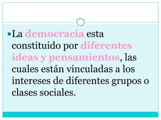 La democracia está constituida por diferentes ideas y pensamientos vinculados a los intereses de grupos sociales. Para que una sociedad sea democrática, debe constituirse como una sociedad humana donde la sociedad civil actúa como mediación entre la familia y el estado. A lo largo del siglo XX, la sociedad civil ha pasado por procesos que han llevado a transformaciones del sistema político mexicano con el fin de satisfacer los ideales del pueblo a través de reformas electorales para mayor equidad.
