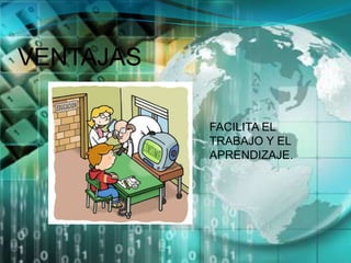 La tecnología de la información tiene ventajas como facilitar el trabajo y el aprendizaje, pero también desventajas como requerir inversiones constantes para mantenerse actualizado y puede afectar al medio ambiente. La informática ha evolucionado y cuenta con ramas como redes, seguridad, soporte técnico y mantenimiento.