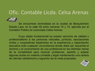 Este documento describe la Oficina Contable de la Licenciada Celsa Arenas en Barquisimeto, Venezuela. La oficina ofrece servicios contables, fiscales y legales a personas y empresas. Su estructura organizativa incluye una junta directiva y departamentos de contabilidad y auxiliar de contabilidad. Entre sus funciones se encuentran realizar cierres trimestrales y anuales, llevar la contabilidad, elaborar estados financieros, y cumplir con obligaciones fiscales. Su misión es ayudar a empresas a cumplir con leyes