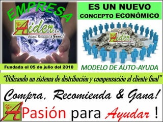 El documento presenta una empresa de marketing multinivel llamada Aider. Ofrece tres equipos: empresarios, clientes y fundadores. Los empresarios reciben capacitación y herramientas de mercadeo. Los clientes ganan ingresos pasivos recomendando productos. Los fundadores lideran el negocio. La empresa busca líderes para expandirse a nivel local, regional y nacional usando una estrategia de distribución en redes que compensa a los consumidores.