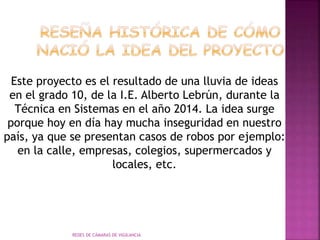 Este documento describe un proyecto de una red de cámaras de vigilancia desarrollado por un grupo de estudiantes. El proyecto tiene como objetivo solucionar problemas de inseguridad en espacios públicos y privados a través de la instalación y monitoreo de cámaras vinculadas a un software de vigilancia. El grupo espera tener el sistema funcionando en 2015 para ofrecer soluciones de seguridad a bajo costo a instituciones educativas, empresas y locales comerciales.