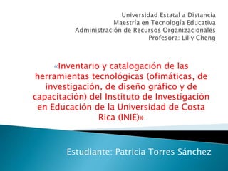 Este documento describe un proyecto para crear un inventario y catálogo digital de las herramientas tecnológicas del Instituto de Investigación en Educación de la Universidad de Costa Rica. El catálogo incluirá las características, requisitos y procesos de solicitud de cada herramienta para optimizar su uso en la investigación.