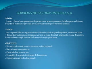 Este documento presenta un proyecto para una empresa llamada Servicios de Gestión Integral S.A. (SGI S.A.) que brindará apoyo a clínicas y hospitales en el manejo de historias clínicas. La misión es lograr las expectativas de los clientes y la visión es convertirse en líder en la organización de historias clínicas en el área de salud. Los objetivos incluyen reconocimiento regional, buena imagen, capacidad de innovación y compromiso del personal. La justificación es que los hospitales necesitan servicios de archivo