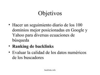 El documento presenta el proyecto backlinks.info, cuyos objetivos son hacer un seguimiento diario de los 100 mejores dominios en Google y Yahoo para diferentes búsquedas y evaluar la calidad de los datos de backlinks. El procedimiento incluye buscar dominios en Google y Yahoo, unificar las listas y analizar los backlinks externos de cada dominio. Los datos están disponibles públicamente en backlinks.info desde julio de 2008 y permiten conocer el posicionamiento actual y pasado de dominios y detectar inconsistencias entre los datos de Google y Yahoo.
