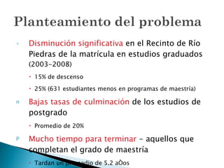 El documento aborda la disminución de la matrícula y las bajas tasas de culminación en estudios de posgrado en la Universidad de Puerto Rico, particularmente en el recinto de Río Piedras, destacando un descenso del 15% entre 2003 y 2008. Se propone mejorar el acceso a programas de posgrado mediante la educación a distancia y la remodelación de la infraestructura tecnológica, además de ofrecer apoyo y becas a estudiantes de bajos ingresos. Se establecen objetivos específicos para el aumento de la matrícula y las tasas de graduación para 2014.