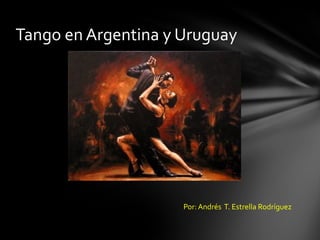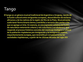 El tango nació como una fusión cultural entre inmigrantes europeos, descendientes de esclavos africanos y nativos en Argentina y Uruguay a finales del siglo XIX. Musicalmente suele tener forma binaria o ternaria. Aunque tiene antecedentes africanos y europeos, se desarrolló principalmente en las ciudades de Buenos Aires y Montevideo como expresión de las clases bajas. Hoy en día sigue siendo importante para la identidad cultural de ambos países y atrae fanáticos de todo el mundo interesados en conocer sus raíces.