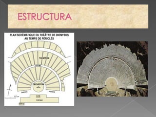 El documento describe el teatro griego antiguo. Se originó como un espacio circular al aire libre donde se realizaban danzas. Los teatros se construían en la ladera de una montaña y contaban con una orquesta central, un koilon con gradas semicirculares para los espectadores, y una skené que servía de escenario. Las representaciones teatrales eran una importante parte de las fiestas religiosas griegas como las Dionisias.