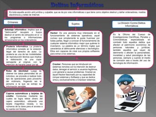 El documento describe varios tipos de crímenes informáticos, incluyendo sabotaje informático, robo de identidad, uso indebido de cajeros automáticos y tarjetas de crédito, y piratería informática. También define los términos "hacker", "cracker" y explica el rol de la División Contra Delitos Informáticos para combatir este tipo de crímenes.