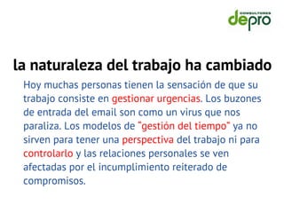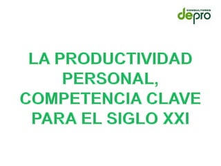 Este documento habla sobre la importancia de mejorar la productividad personal a través del desarrollo de competencias como la proactividad, perspectiva, control y evaluación. Menciona que la productividad de una organización depende de la productividad individual de sus empleados. Señala que es necesario pasar de organizaciones productivas con personas innovadoras, a organizaciones que innovan a través de la productividad de sus personas.