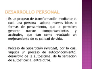 Este documento trata sobre conceptos clave relacionados con la autoestima, la comunicación y la resolución de conflictos. Define la autoestima como la percepción evaluativa positiva o negativa que tenemos de nosotros mismos, y explica que se construye a través del autoconocimiento y las interacciones con los demás. Describe la comunicación como un proceso que involucra elementos verbales y no verbales, y la escucha activa como una habilidad importante. Finalmente, presenta formas positivas y negativas de enfrentar los conflictos, enfatiz