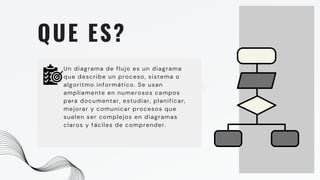 El documento describe qué es un diagrama de flujo y su utilidad en la documentación y comprensión de procesos complejos en diversas disciplinas. Se mencionan diferentes tipos de diagramas de flujo, incluyendo diagramas de flujo de datos, sistemas y programas, así como el diagrama de carriles de nado. Además, se presentan los símbolos más comunes utilizados en estos diagramas, como óvalos, paralelogramos, rectángulos y diamantes, que representan diversas acciones y decisiones en un proceso.