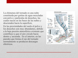 El documento describe la composición y formación de los tornados. Explica que la chimenea de un tornado está compuesta de gotitas de agua, polvo y partículas que descienden desde las nubes hasta la superficie. La baja presión atmosférica en el suelo hace que el aire circule hacia adentro y hacia arriba en el ojo del tornado, donde ocurren descargas eléctricas. Los tornados pueden tener una o varias chimeneas y duran desde segundos hasta decenas de minutos, formándose típicamente debido a la inestabil