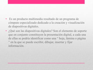 Una presentación digital es un producto multimedia creado con un programa como PowerPoint que consiste en diapositivas digitales que contienen información como texto, imágenes y gráficos. PowerPoint fue inventado en 1984 y adquirido por Microsoft en 1987. Las presentaciones digitales proveen una estructura para presentar información de manera organizada y facilitan la actualización del contenido; también pueden incluir efectos visuales y de sonido que ayudan a motivar al público.