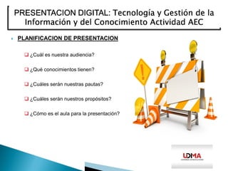 Este documento ofrece consejos para planificar y dar una presentación efectiva, incluyendo considerar la audiencia, organizar y clasificar la información, usar mapas mentales e ilustraciones, tomarse tiempo entre diapositivas para aclarar ideas, y construir ideas para involucrar a la audiencia emocionalmente.
