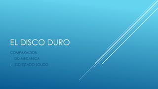 Este documento compara los discos duros mecánicos (HDD) y los discos duros de estado sólido (SSD). Los HDD usan platos giratorios y cabezales magnéticos, mientras que los SSD usan memoria flash sin partes móviles. Los SSD tienen mayor velocidad de lectura y escritura, menor latencia, consumo de energía y producción de calor en comparación con los HDD, pero también tienen un precio más alto y menor capacidad.