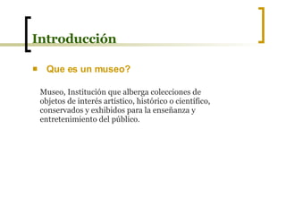 El documento presenta información sobre los museos. Define qué es un museo y brinda un breve resumen de la historia de los museos desde los primeros museos en Alejandría hasta los museos modernos que surgieron en Europa en el siglo XVIII. Luego describe algunos museos nacionales de Honduras, incluyendo su ubicación, características arquitectónicas y colecciones. Finalmente, presenta algunas normativas y criterios de diseño para la iluminación y seguridad en los museos.