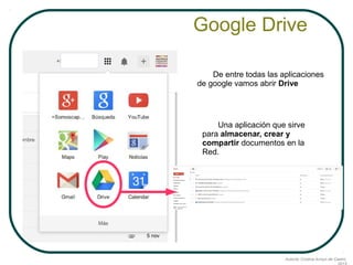 El documento describe cómo utilizar Google Drive para almacenar, crear y compartir documentos de manera efectiva. Se detalla la importancia de organizar archivos en carpetas, las opciones de formato y edición, y cómo colaborar con otros usuarios dentro de la plataforma. También se menciona la posibilidad de recuperar versiones anteriores y chatear en tiempo real con los colaboradores.
