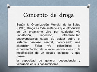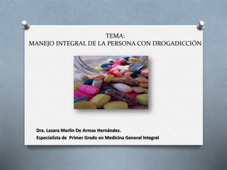 El documento trata sobre el manejo integral de la persona con drogadicción. Explica conceptos clave como droga, dependencia, tolerancia y síndrome de abstinencia según la OMS. Identifica factores que llevan a la drogadicción como presión social, problemas familiares y búsqueda de escape a problemas. Describe tipos de drogas como duras, blandas, lícitas e ilícitas, así como tipos de consumo. Finalmente, analiza drogas específicas como cannabis y cocaína, detallando sus efectos físicos y psicol