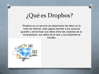 Dropbox es un servicio de almacenamiento en la nube que permite a los usuarios guardar y sincronizar archivos entre sus computadoras, la web y dispositivos móviles de forma gratuita con 2GB de espacio. Los usuarios pueden acceder a sus archivos desde cualquier lugar con internet, recuperar versiones anteriores de los archivos y compartir archivos con otros. Para usar Dropbox, los usuarios deben registrarse en el sitio web de Dropbox y descargar el programa en su computadora.