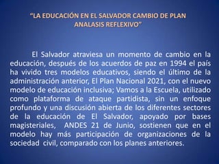 Este documento analiza el cambio reciente en el sistema educativo de El Salvador con la introducción del plan "Vamos a la Escuela". Discute los tres modelos educativos desde 1994 y los problemas que enfrentan, como baja calidad, deserción y falta de recursos. También examina las líneas estratégicas y programas insignia del nuevo plan, así como los desafíos que enfrenta debido a problemas sociales y dependencia de créditos internacionales. Concluye que se necesita invertir en una educación de calidad e integrada para lograr el desarrol