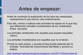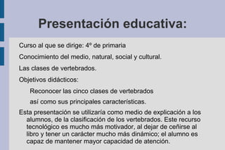 Este documento presenta una presentación educativa sobre las cinco clases de vertebrados (peces, mamíferos, aves, anfibios y reptiles) dirigida a estudiantes de 4o grado. Primero se realiza una actividad de repaso sobre la diferencia entre animales vertebrados e invertebrados. Luego, se describen las características principales de cada clase de vertebrados y se incluyen actividades finales para recordar la lección.